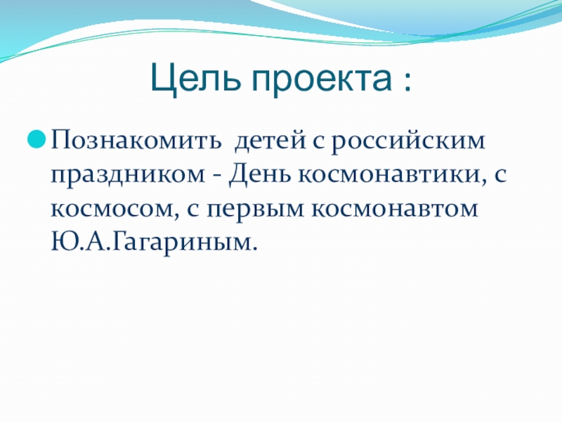 Цель проекта :Познакомить детей с российским праздником - День космонавтики, с космосом, с первым космонавтом Ю.А.Гагариным.