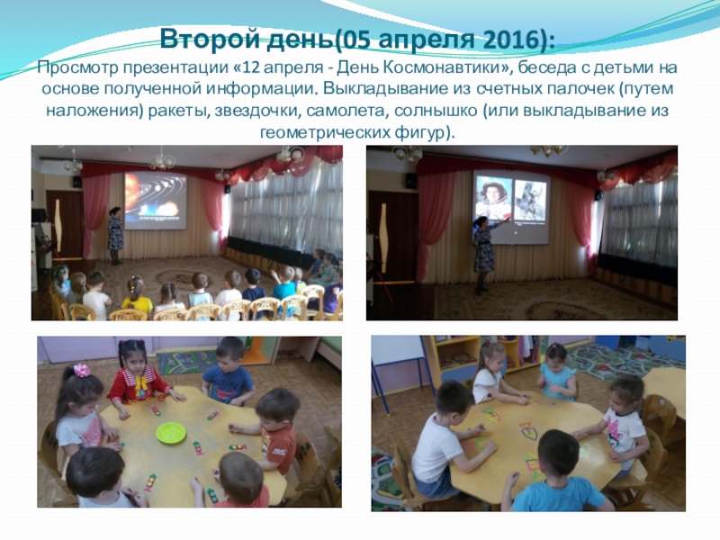 Слайд 6 Второй день(05 апреля 2016): Просмотр презентации «12 апреля - День Космонавтики», беседа