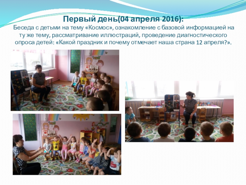 Слайд 5 Первый день(04 апреля 2016): Беседа с детьми на тему «Космос», ознакомление с