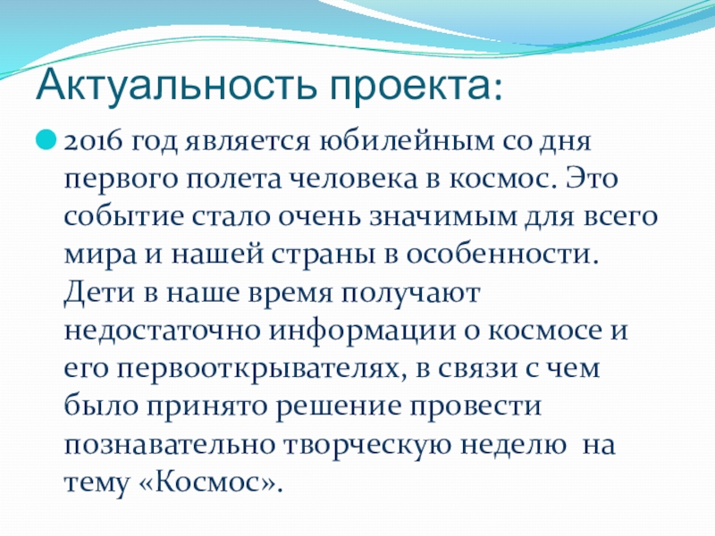 Актуальность проекта:2016 год является юбилейным со дня первого полета человека в космос. Это событие стало очень значимым для всего мира и нашей страны в особенности. Дети в наше время получают недостаточно информации о космосе и его