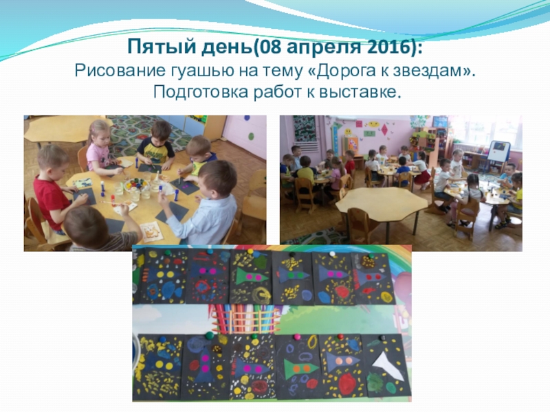 Слайд 9Пятый день(08 апреля 2016): Рисование гуашью на тему «Дорога к звездам». Подготовка