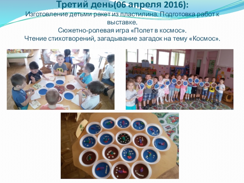 Слайд 7Третий день(06 апреля 2016): Изготовление детьми ракет из пластилина. Подготовка работ к