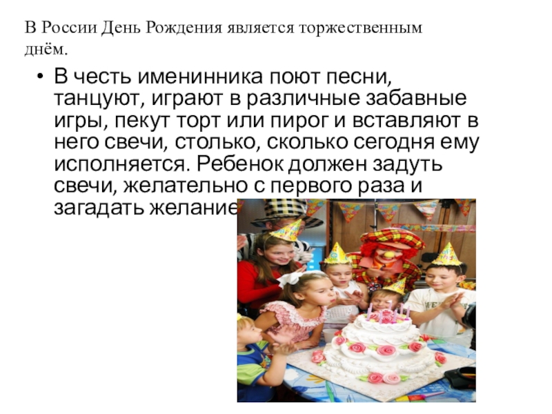 В России День Рождения является торжественным днём.В честь именинника поют песни, танцуют, играют в различные забавные игры, пекут торт или пирог и вставляют в него свечи, столько, сколько сегодня ему исполняется. Ребенок должен задуть свечи, желательно