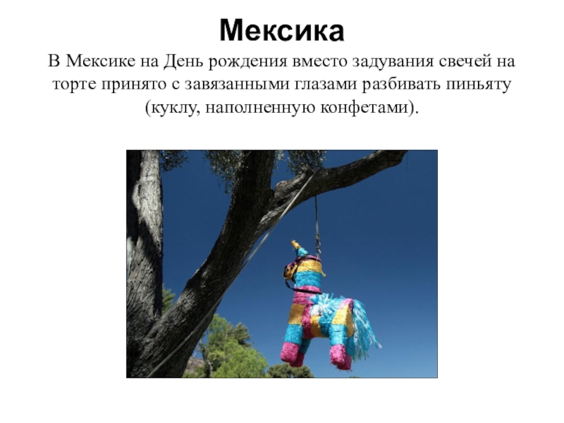 Мексика В Мексике на День рождения вместо задувания свечей на торте принято с завязанными глазами разбивать пиньяту