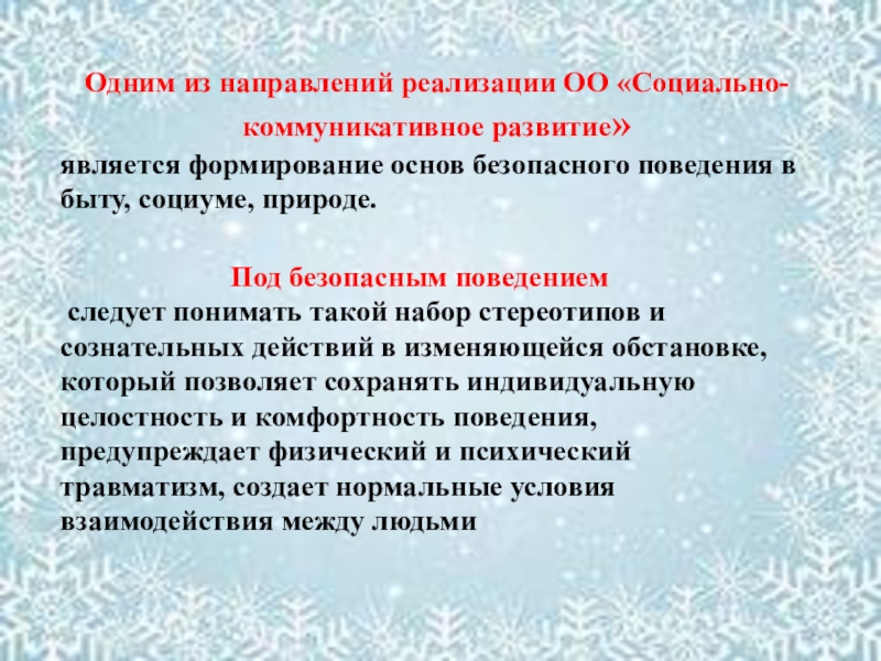 следует понимать такой набор стереотипов и сознательных действий в изменяющейся обстановке, который позволяет сохранять индивидуальную целостность и комфортность поведения, предупреждает физический и психический травматизм, создает нормальные условия взаимодействия между людьми