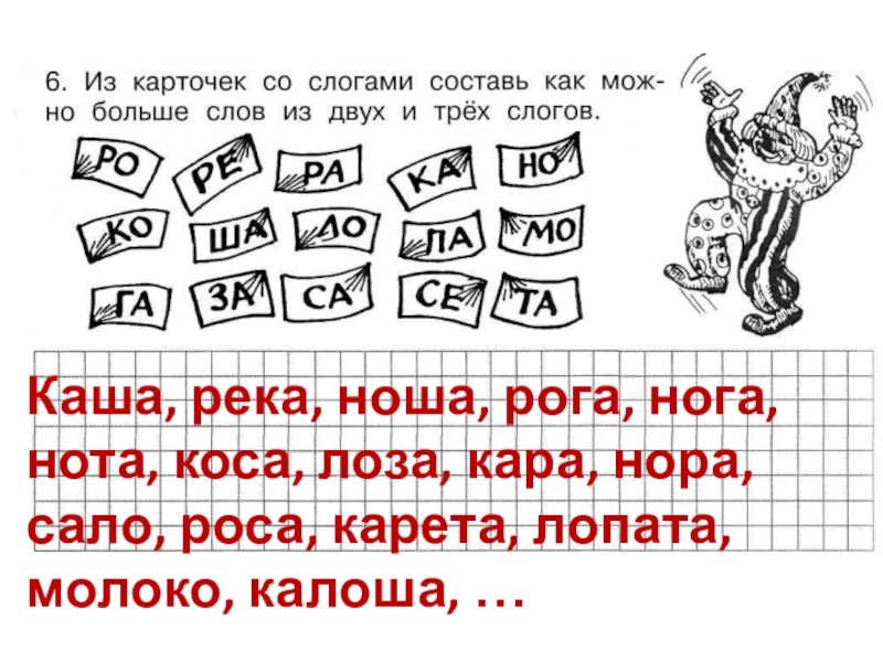 Слайд 8Каша, река, ноша, рога, нога, нота, коса, лоза, кара, нора, сало,