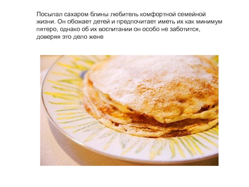 Слайд 34Посыпал сахаром блины любитель комфортной семейной жизни. Он обожает детей и