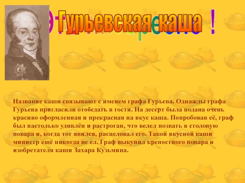 Название каши связывают с именем графа Гурьева. Однажды