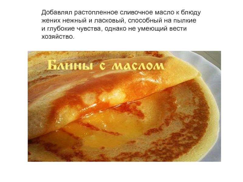 Слайд 33Добавлял растопленное сливочное масло к блюду жених нежный и ласковый, способный