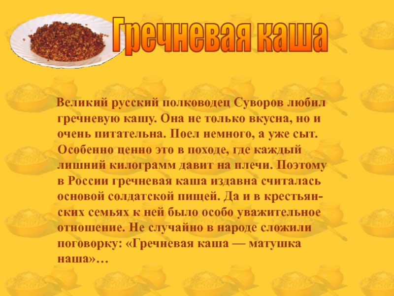 гречневую кашу. Она не только вкусна, но и очень питательна. Поел немного, а уже сыт. Особенно ценно это в походе, где каждый лишний килограмм давит на плечи. Поэтому в России гречневая каша издавна считалась основой солдатской пищей. Да и в крестьян-ских семьях к ней было особо уважительное отношение. Не случайно в народе сложили поговорку: «Гречневая каша — матушка наша»…