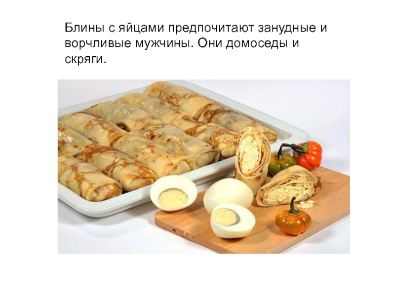 Слайд 35Блины с яйцами предпочитают занудные и ворчливые мужчины. Они домоседы и
