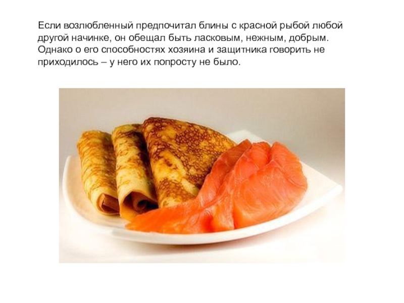 Слайд 30Если возлюбленный предпочитал блины с красной рыбой любой другой начинке, он