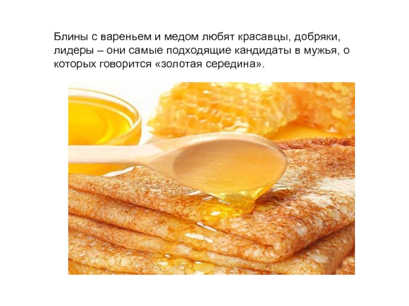 Слайд 36Блины с вареньем и медом любят красавцы, добряки, лидеры – они