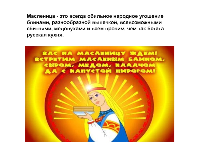 Слайд 37Масленица - это всегда обильное народное угощение блинами, разнообразной выпечкой, всевозможными