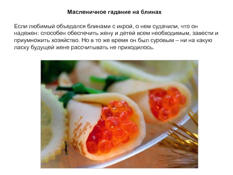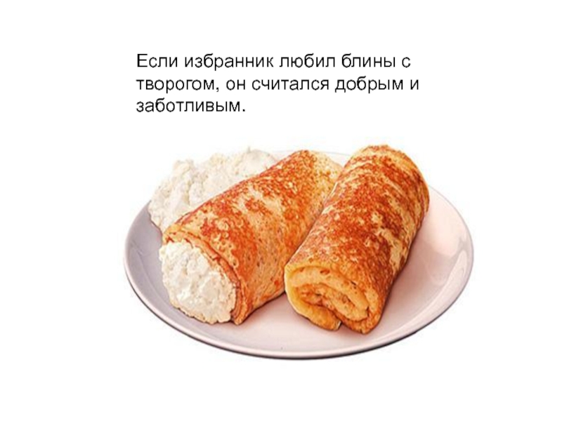 Слайд 31Если избранник любил блины с творогом, он считался добрым и заботливым.