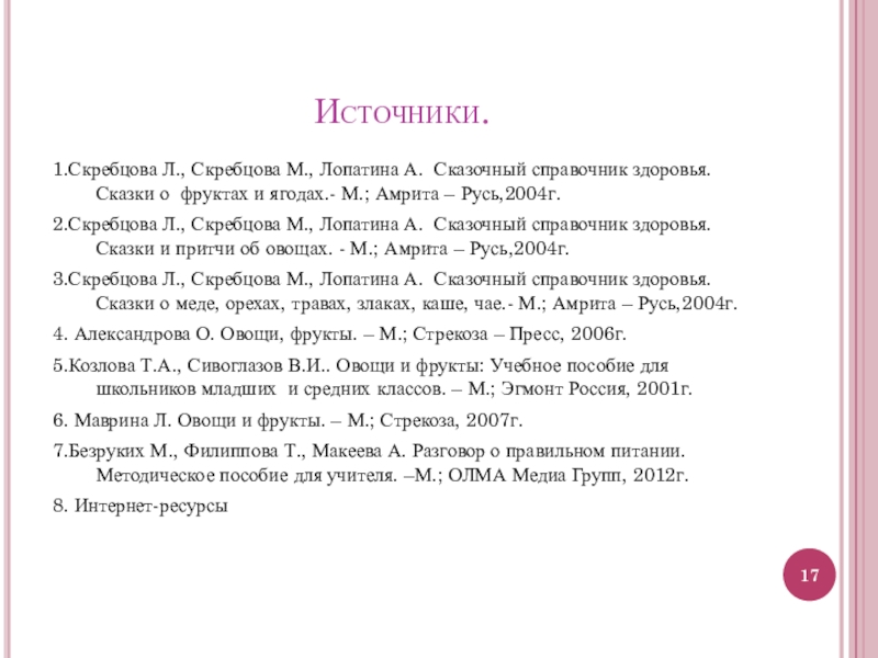 2.Скребцова Л., Скребцова М., Лопатина А. Сказочный справочник здоровья. Сказки и притчи об овощах. - М.; Амрита – Русь,2004г.