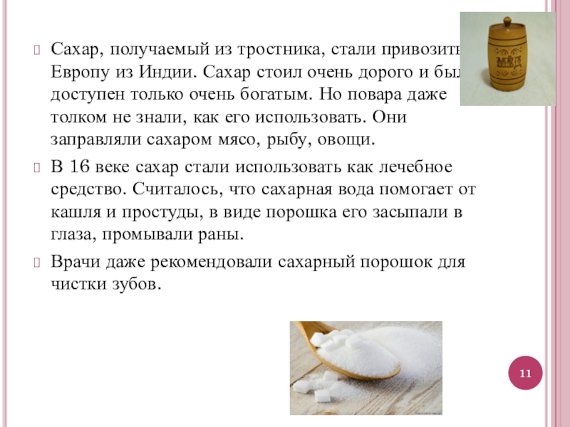 Слайд 11Сахар, получаемый из тростника, стали привозить в Европу из Индии. Сахар
