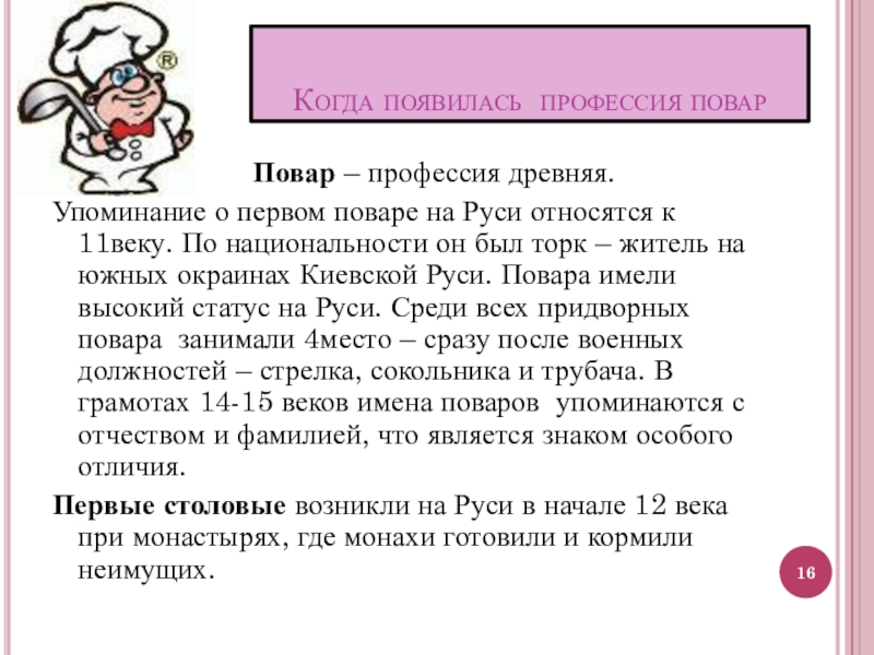 Слайд 16Когда появилась профессия повар