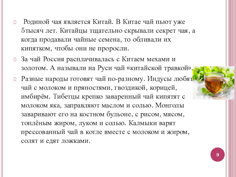 Слайд 9 Родиной чая является Китай. В Китае чай пьют уже 5тысяч