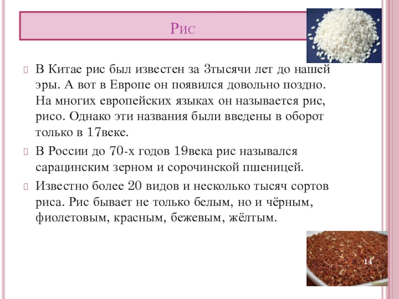 эры. А вот в Европе он появился довольно поздно. На многих европейских языках он называется рис, рисо. Однако эти названия были введены в оборот только в 17веке.