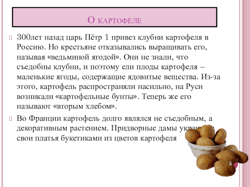 Но крестьяне отказывались выращивать его, называя «ведьминой ягодой». Они не знали, что съедобны клубни, и поэтому ели плоды картофеля – маленькие ягоды, содержащие ядовитые вещества. Из-за этого, картофель распространяли насильно, на Руси возникали «картофельные бунты». Теперь же его называют «вторым хлебом».