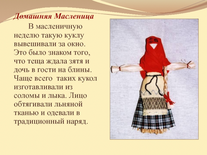 знаком того, что теща ждала зятя и дочь в гости на блины. Чаще всего таких кукол изготавливали из соломы и лыка. Лицо обтягивали льняной тканью и одевали в традиционный наряд.