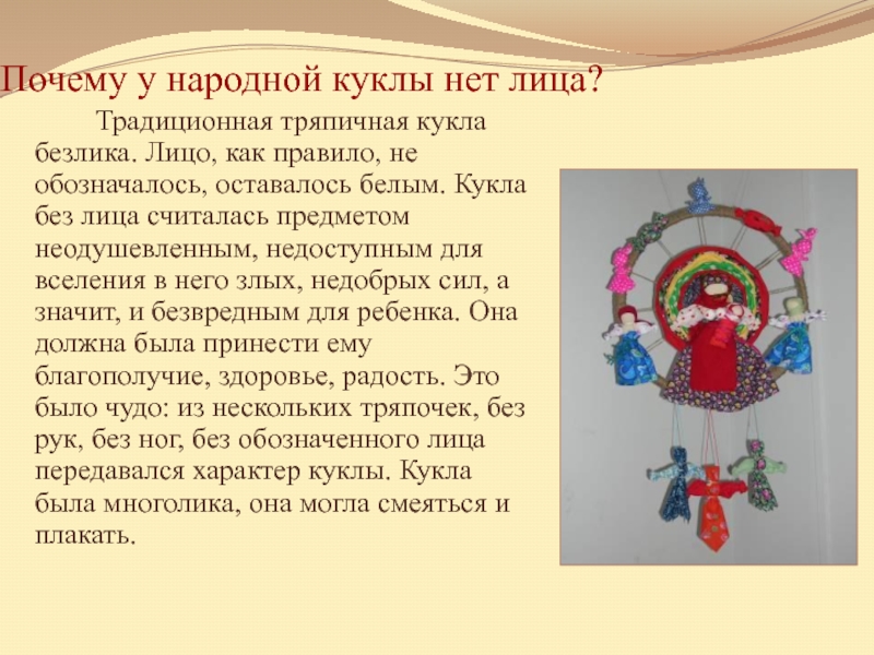 Слайд 2Почему у народной куклы нет лица?