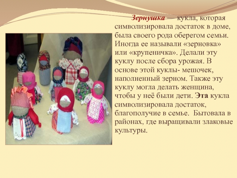 Слайд 5 Зернушка — кукла, которая символизировала достаток в доме, была своего рода