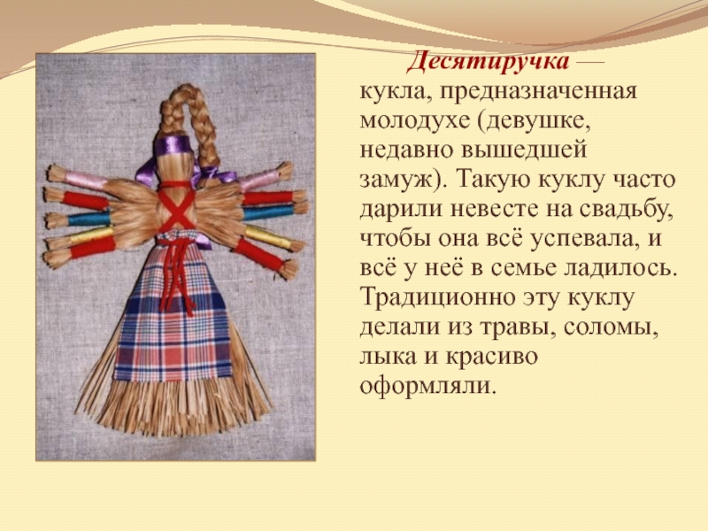 Слайд 16 Десятиручка — кукла, предназначенная молодухе (девушке, недавно вышедшей замуж). Такую куклу