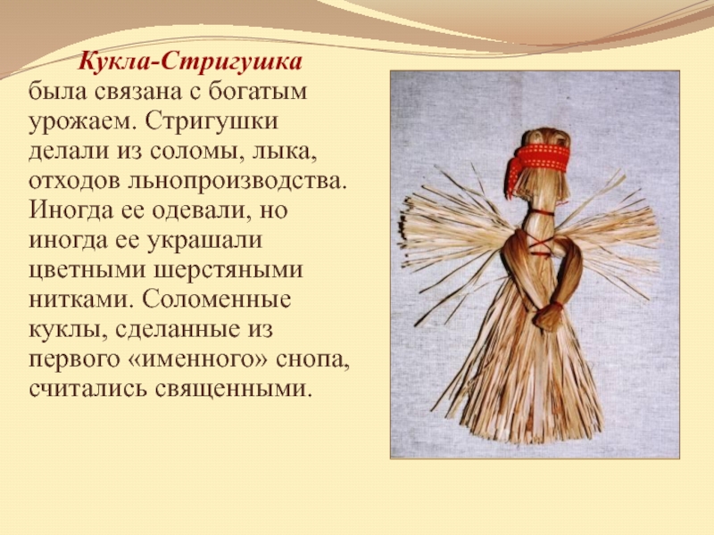 Слайд 10 Кукла-Стригушка была связана с богатым урожаем. Стригушки делали из соломы, лыка,