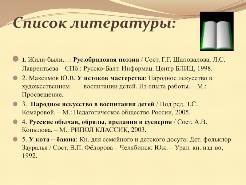 5. У кота – баюна: Кн. для семейного и детского досуга: Дет. фольклор Зауралья / Сост. В.П. Фёдорова – Челябинск: Юж. – Урал. кн. изд-во, 1992.