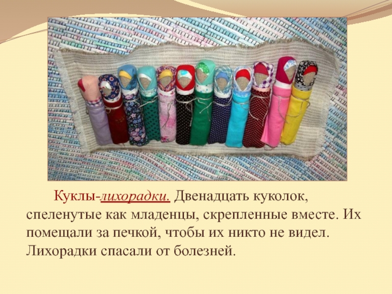 Слайд 8 Куклы-лихорадки. Двенадцать куколок, спеленутые как младенцы, скрепленные вместе. Их помещали за