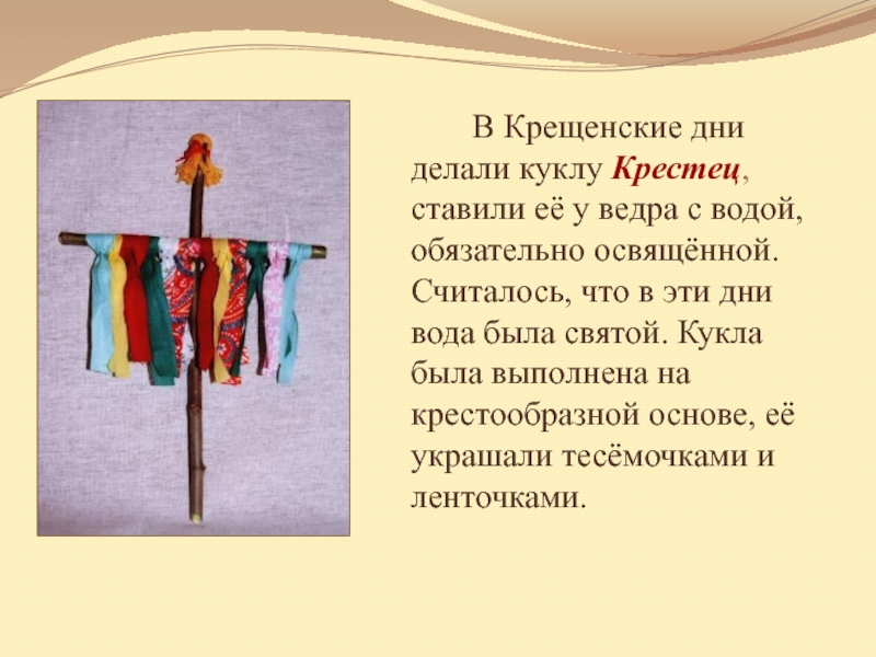 Слайд 11 В Крещенские дни делали куклу Крестец, ставили её у ведра с
