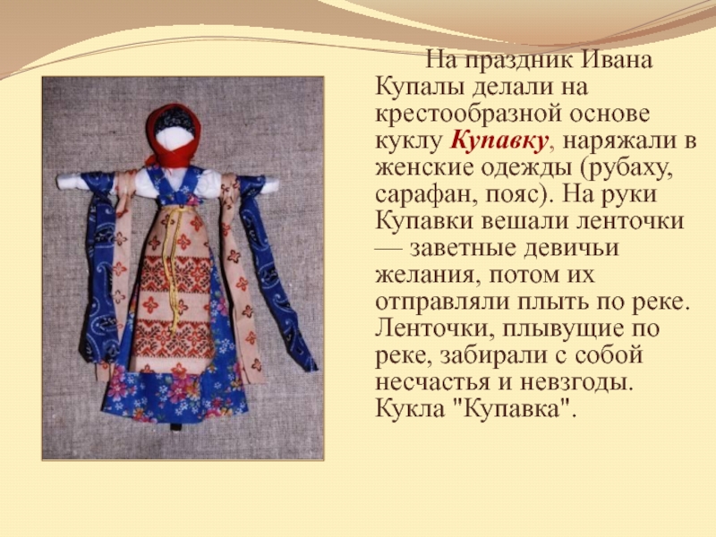 Слайд 14 На праздник Ивана Купалы делали на крестообразной основе куклу Купавку, наряжали