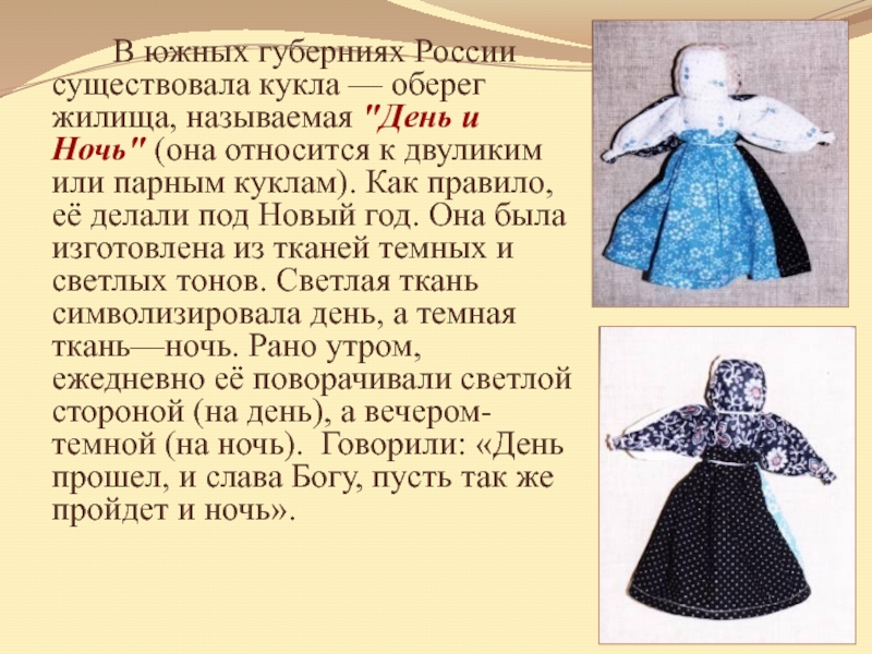 и Ночь" (она относится к двуликим или парным куклам). Как правило, её делали под Новый год. Она была изготовлена из тканей темных и светлых тонов. Светлая ткань символизировала день, а темная ткань—ночь. Рано утром, ежедневно её поворачивали светлой стороной (на день), а вечером- темной (на ночь). Говорили: «День прошел, и слава Богу, пусть так же пройдет и ночь».