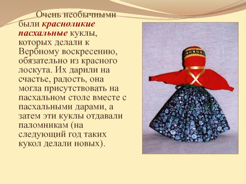 Слайд 12 Очень необычными были красноликие пасхальные куклы, которых делали к Вербному воскресению,