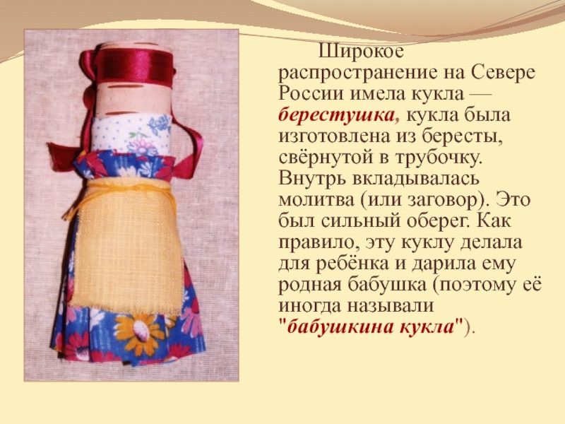 Слайд 4 Широкое распространение на Севере России имела кукла — берестушка, кукла была