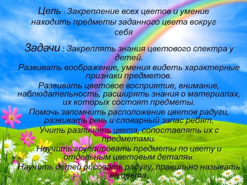 Помочь запомнить расположение цветов радуги, развивать речь и словарный запас ребят.