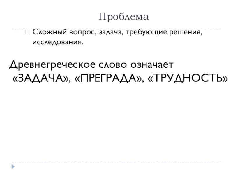 ПроблемаСложный вопрос, задача, требующие решения, исследования.Древнегреческое слово означает «ЗАДАЧА», «ПРЕГРАДА», «ТРУДНОСТЬ»