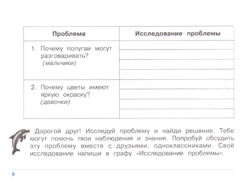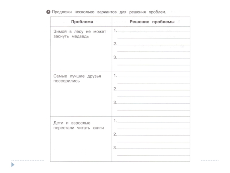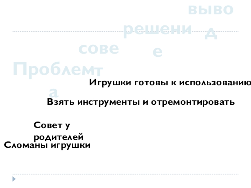 ПроблемасоветрешениевыводСломаны игрушкиСовет у родителейВзять инструменты и отремонтироватьИгрушки готовы к использованию