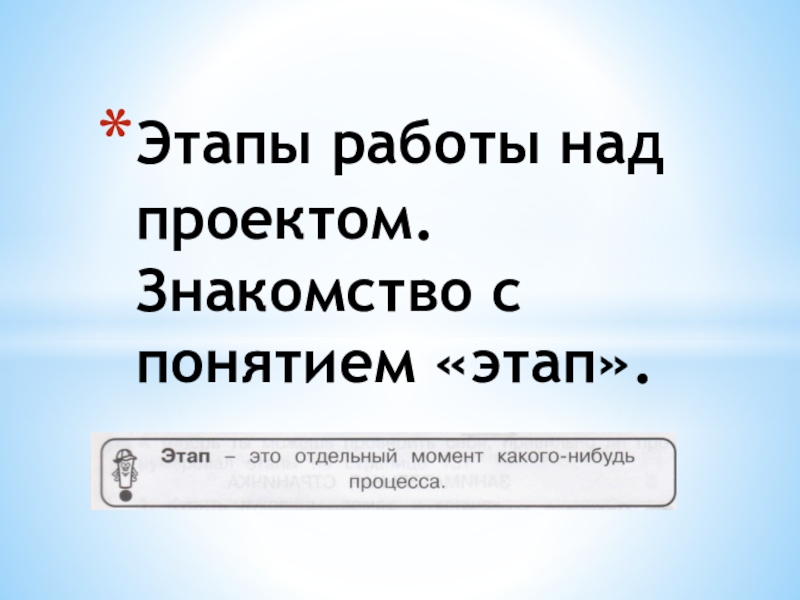 Слайд 1Этапы работы над проектом. Знакомство с понятием «этап».
