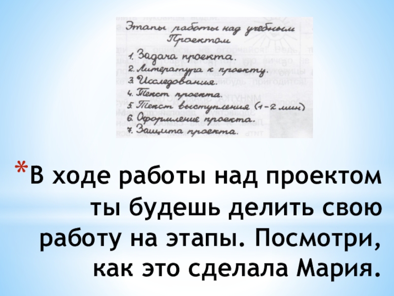 В ходе работы над проектом ты будешь делить свою работу на этапы. Посмотри, как это сделала Мария.