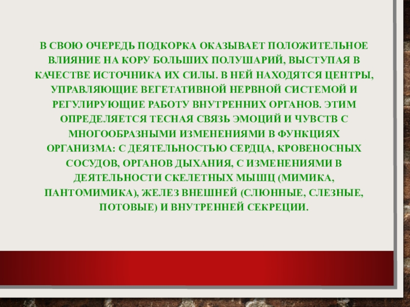 ВЫСТУПАЯ В КАЧЕСТВЕ ИСТОЧНИКА ИХ СИЛЫ. В НЕЙ НАХОДЯТСЯ ЦЕНТРЫ, УПРАВЛЯЮЩИЕ ВЕГЕТАТИВНОЙ НЕРВНОЙ СИСТЕМОЙ И РЕГУЛИРУЮЩИЕ РАБОТУ ВНУТРЕННИХ ОРГАНОВ. ЭТИМ ОПРЕДЕЛЯЕТСЯ ТЕСНАЯ СВЯЗЬ ЭМОЦИЙ И ЧУВСТВ С МНОГООБРАЗНЫМИ ИЗМЕНЕНИЯМИ В ФУНКЦИЯХ ОРГАНИЗМА: С ДЕЯТЕЛЬНОСТЬЮ СЕРДЦА, КРОВЕНОСНЫХ СОСУДОВ, ОРГАНОВ ДЫХАНИЯ, С ИЗМЕНЕНИЯМИ В ДЕЯТЕЛЬНОСТИ СКЕЛЕТНЫХ МЫШЦ (МИМИКА, ПАНТОМИМИКА), ЖЕЛЕЗ ВНЕШНЕЙ (СЛЮННЫЕ, СЛЕЗНЫЕ, ПОТОВЫЕ) И ВНУТРЕННЕЙ СЕКРЕЦИИ.