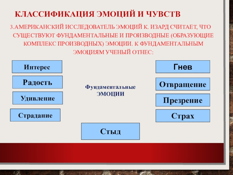 СУЩЕСТВУЮТ ФУНДАМЕНТАЛЬНЫЕ И ПРОИЗВОДНЫЕ (ОБРАЗУЮЩИЕ КОМПЛЕКС ПРОИЗВОДНЫХ) ЭМОЦИИ. К ФУНДАМЕНТАЛЬНЫМ ЭМОЦИЯМ УЧЕНЫЙ ОТНЕС:
