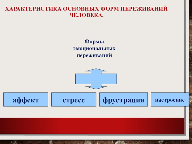 Слайд 22ХАРАКТЕРИСТИКА ОСНОВНЫХ ФОРМ ПЕРЕЖИВАНИЙ ЧЕЛОВЕКА.