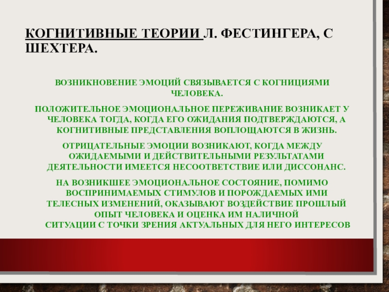 Слайд 21КОГНИТИВНЫЕ ТЕОРИИ Л. ФЕСТИНГЕРА, С ШЕХТЕРА.