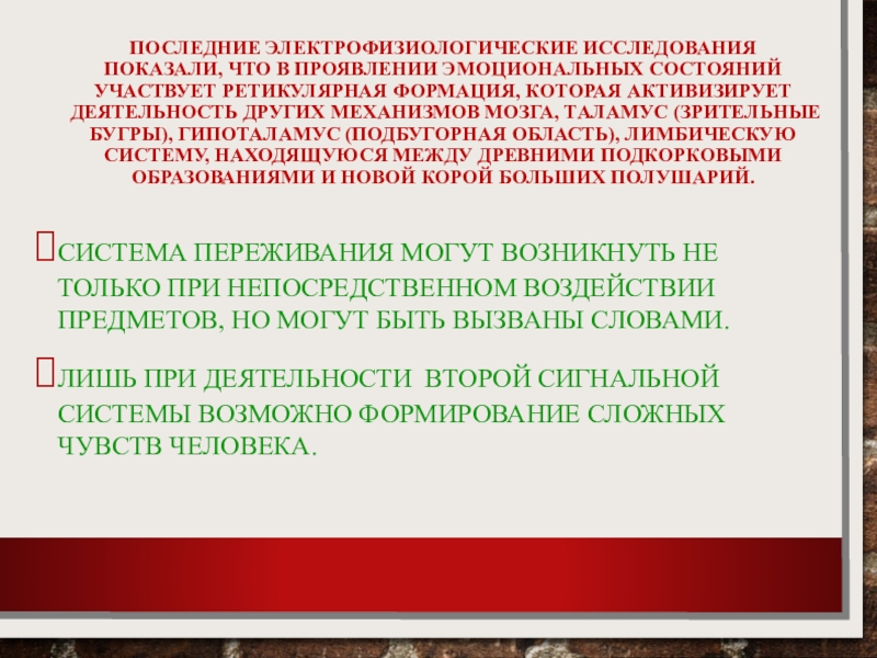 Слайд 15ПОСЛЕДНИЕ ЭЛЕКТРОФИЗИОЛОГИЧЕСКИЕ ИССЛЕДОВАНИЯ ПОКАЗАЛИ, ЧТО В ПРОЯВЛЕНИИ ЭМОЦИОНАЛЬНЫХ СОСТОЯНИЙ УЧАСТВУЕТ РЕТИКУЛЯРНАЯ