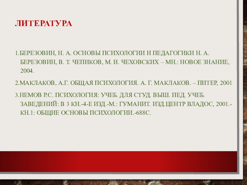 3.НЕМОВ Р.С. ПСИХОЛОГИЯ: УЧЕБ. ДЛЯ СТУД. ВЫШ. ПЕД. УЧЕБ. ЗАВЕДЕНИЙ: В 3 КН.-4-Е ИЗД.-М.: ГУМАНИТ. ИЗД.ЦЕНТР ВЛАДОС, 2001.-КН.1: ОБЩИЕ ОСНОВЫ ПСИХОЛОГИИ.-688С.