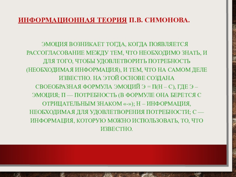 СВОЕОБРАЗНАЯ ФОРМУЛА ЭМОЦИЙ Э = П(Н – С), ГДЕ Э – ЭМОЦИЯ; П — ПОТРЕБНОСТЬ (В ФОРМУЛЕ ОНА БЕРЕТСЯ С ОТРИЦАТЕЛЬНЫМ ЗНАКОМ «-»); Н – ИНФОРМАЦИЯ, НЕОБХОДИМАЯ ДЛЯ УДОВЛЕТВОРЕНИЯ ПОТРЕБНОСТИ; С — ИНФОРМАЦИЯ, КОТОРУЮ МОЖНО ИСПОЛЬЗОВАТЬ, ТО, ЧТО ИЗВЕСТНО.