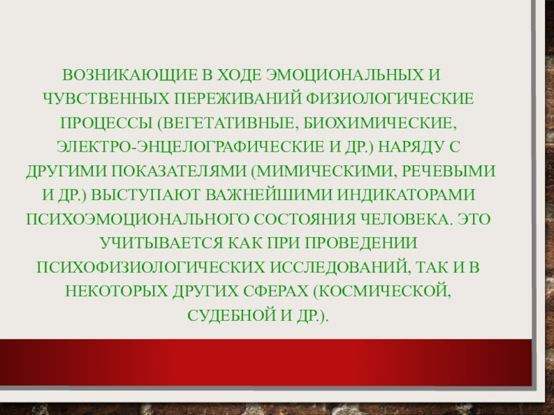 ЭЛЕКТРО-ЭНЦЕЛОГРАФИЧЕСКИЕ И ДР.) НАРЯДУ С ДРУГИМИ ПОКАЗАТЕЛЯМИ (МИМИЧЕСКИМИ, РЕЧЕВЫМИ И ДР.) ВЫСТУПАЮТ ВАЖНЕЙШИМИ ИНДИКАТОРАМИ ПСИХОЭМОЦИОНАЛЬНОГО СОСТОЯНИЯ ЧЕЛОВЕКА. ЭТО УЧИТЫВАЕТСЯ КАК ПРИ ПРОВЕДЕНИИ ПСИХОФИЗИОЛОГИЧЕСКИХ ИССЛЕДОВАНИЙ, ТАК И В НЕКОТОРЫХ ДРУГИХ СФЕРАХ (КОСМИЧЕСКОЙ, СУДЕБНОЙ И ДР.).